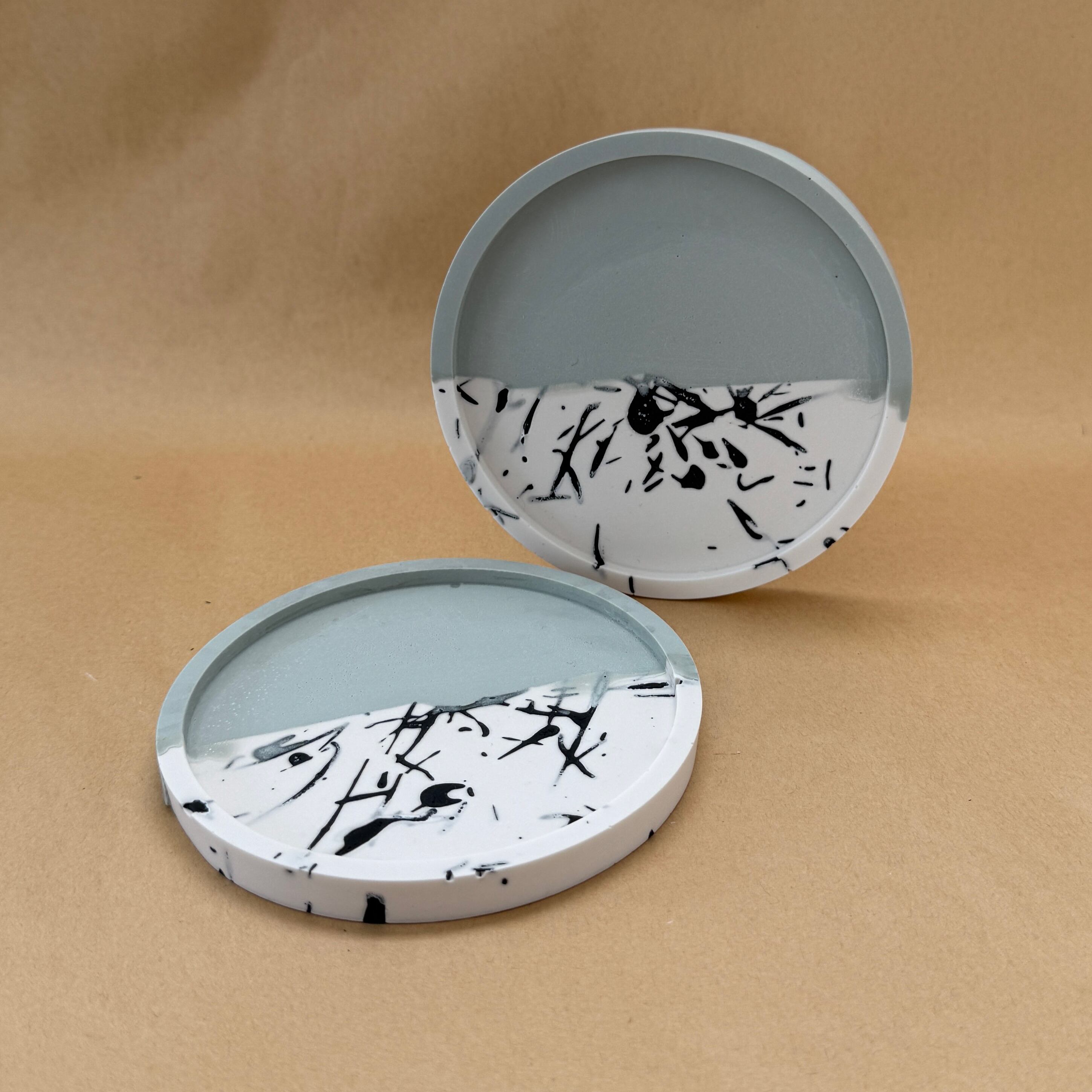 静けさとアートの融合。柔らかなグリーンとホワイトにインクのような模様が描かれた、ハンドメイドデザインコースターです。シンプルながらも、空間に洗練されたアクセントを添えます。